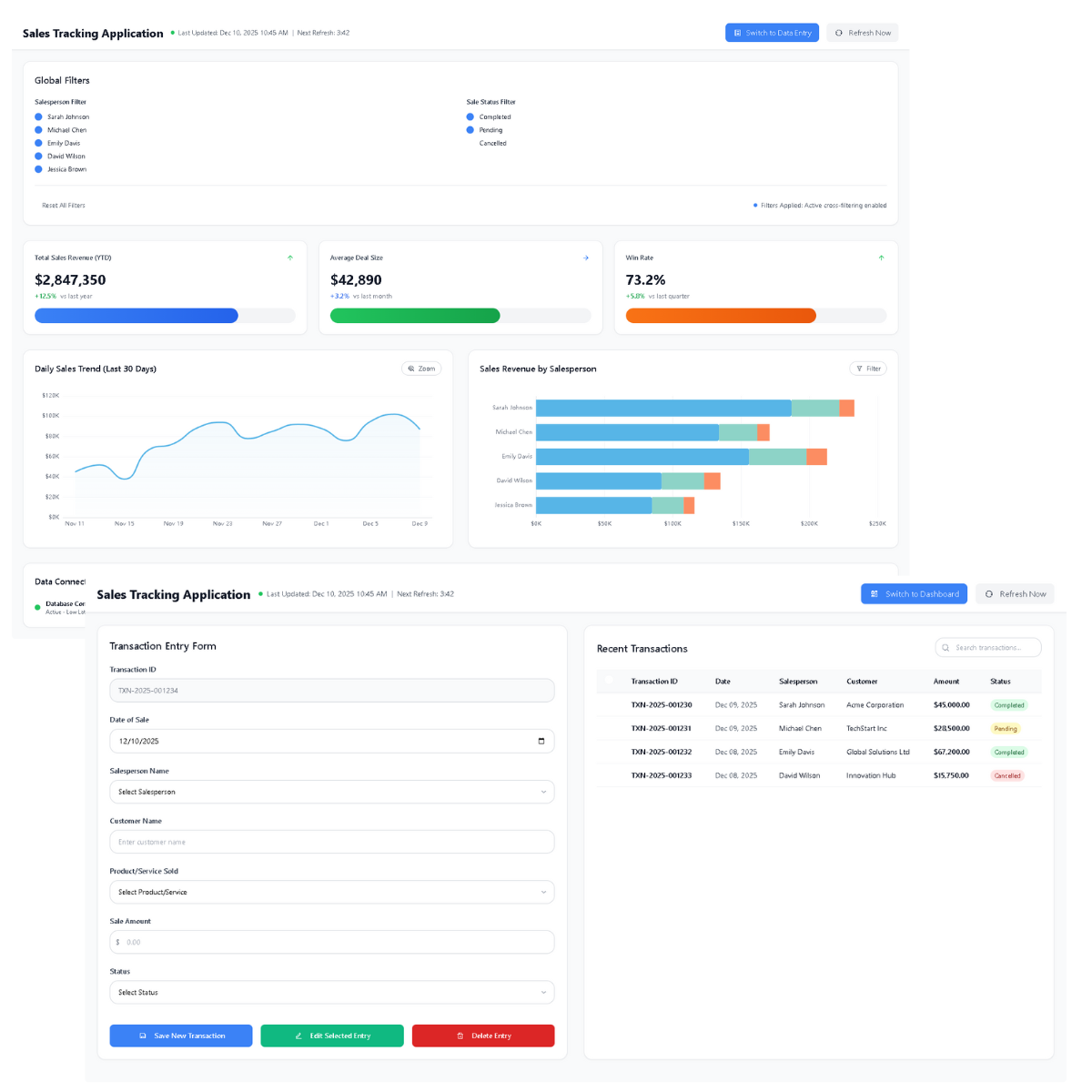 Visualize your daily sales trends and revenue distribution per salesperson through interactive charts and graphs.